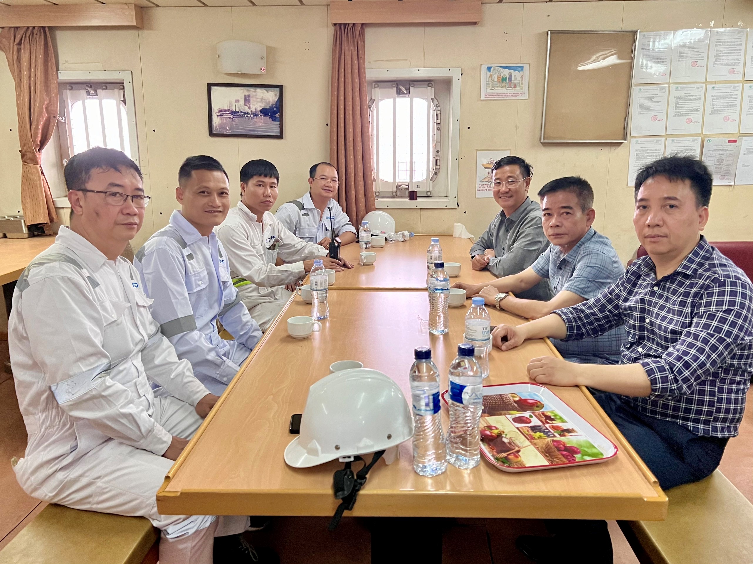 (Ảnh: Lãnh đạo và cán bộ kỹ thuật của Công ty làm việc với thuyền viên tàu Đại Thành)