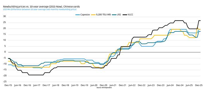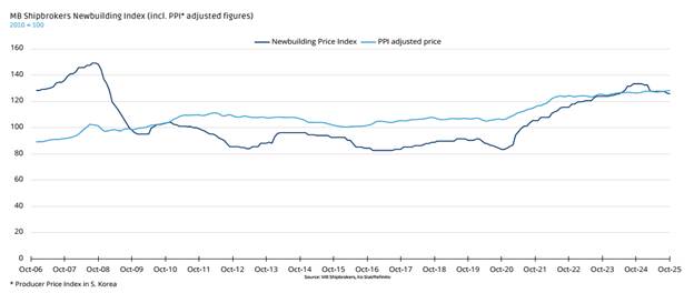 2. Giá tàu đóng mới: Sự gia tăng nhu cầu trong quý 4/2025 đã đẩy giá tàu đóng mới tăng trở lại