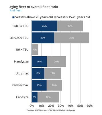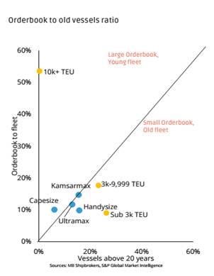 Biểu đồ trên phản ánh các tàu container có tỷ lệ đội tàu già thấp nhất so với tàu hàng rời và tàu dầu, phản ảnh xu hướng đầu tư mạnh mẽ vào các tàu container cỡ lớn. Tuy nhiên vẫn còn 20% đội tàu cần thay thế, đặc biệt là tàu dưới 10k TEU. Tàu hàng rời có tỷ lệ tàu già là 27% nhưng đầu tư mới chưa mạnh bằng tàu container (đặc biệt với phân khúc ultramax và kamsamax) và tàu dầu có tỷ lệ tàu già cao nhất.