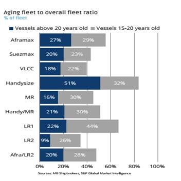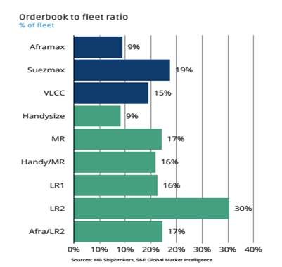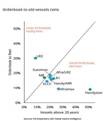 Theo biểu đồ, đội tàu LR2 và Suexmax đang khá trẻ, lượng đặt đóng mới nhiều (tàu trên 20 tuổi chỉ chiếm khoảng 10% còn tàu đặt đóng lần lượt là khoảng 40% và 10%). Tàu cỡ MR đang tương đối cân bằng, tàu trên 20 tuổi khoảng 20% và tàu đặt đóng khoảng 20%. Cỡ tàu Handy/MR và Aframax đang khá già (tàu trên 20 tuổi lần lượt là 30% và 20% còn tàu đóng mới là 10% và 15%). Tàu handysize rất già, gần như không được thay thế (số tàu đóng mới chỉ đạt 5% trong khi tàu trên 20 tuổi đã gần 50%. |