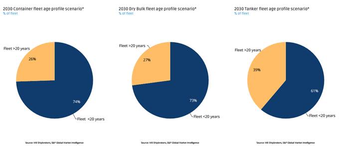 - Đối với các đội tàu: container, hàng rời và chở dầu, ước tính lần lượt có 26%, 27% và 39% số tàu hiện tại sẽ trên 20 năm tuổi vào năm 2030 (tính cả lượng tàu đặt đóng hiện tại). Điều này cho thấy, mặc dù hoạt động ký hợp đồng tăng cao và số đơn hàng trên toàn cầu lớn, một phần đáng kể đội tàu thế giới đang già đi nhanh chóng, phản ánh làn sóng giao tàu lớn vào khoảng năm 2010.