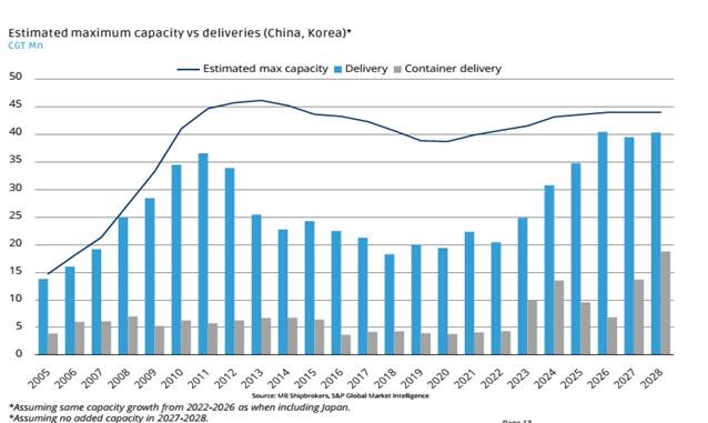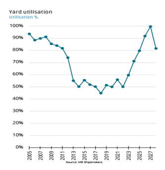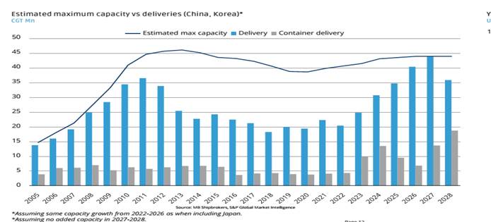 - Nếu không có trì hoãn, mức độ sử dụng công suất của các nhà máy đóng tàu tại Trung Quốc và Hàn Quốc dự kiến sẽ đạt 100% vào năm 2027. Nếu giả định có 10% sản lượng được trì hoãn từ năm 2027 sang 2028, thì lượng tàu bàn giao năm 2028 vẫn ngang bằng các năm trước, cho thấy việc tại các nhà máy Trung Quốc và Hàn Quốc đã kín slot đến năm 2028. Công suất của các nhà máy tại hai quốc gia này dự kiến sẽ duy trì trên 90% trong giai đoạn 2026–2028, đánh dấu mức cao nhất kể từ năm 2008.
