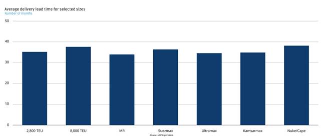 Các tàu cỡ lớn như Cape/Suezmax, container 8.000 Teu có thời gian bàn giao từ 40-45 tháng. Các tàu Ultramax, Kamsamax, MR… có thời gian giao từ 30-35 tháng. Như vậy, nếu đặt đóng tàu tại thời điểm này, dự kiến đến năm 2028 mới nhận bàn giao.