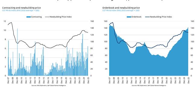 - Sau khi hoạt động đóng tàu chững lại nhẹ trong quý 3/2025 khiến giá một số phân khúc giảm tạm thời, hoạt động ký hợp đồng đã phục hồi vào tháng 11, đẩy giá đóng tàu về mức của năm 2024. Diễn biến giá này được hỗ trợ bởi sự tăng trở lại trong nhu cầu đóng mới tàu chở LNG, do các dự án hóa lỏng dự kiến sẽ tăng sản lượng trong những năm tới.