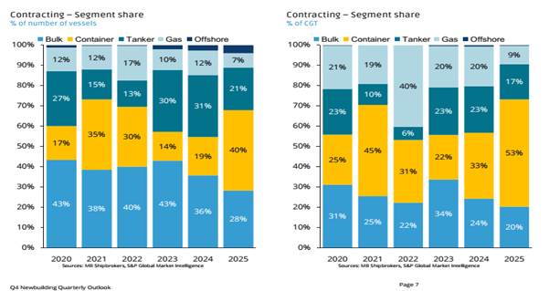 - Tổng số hợp đồng đóng mới năm 2025 thấp hơn mức của năm 2024. Mặc dù số lượng hợp đồng tàu container vượt qua năm trước, nhưng các phân khúc khác đều giảm. Tuy nhiên, số lượng đơn đặt đóng đã đạt mức cao nhất kể từ năm 2008, phản ánh khối lượng lớn các đơn đặt hàng trong những năm gần đây, dự kiến sẽ giao trong giai đoạn 2026–2028.