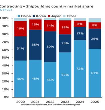 Biểu đồ cho thấy thị trường đóng tàu toàn cầu đang tập trung vào ba quốc gia chính là Trung Quốc, Hàn Quốc và Nhật Bản. Ngành đóng tàu Trung Quốc tăng trưởng mạnh mẽ và chiếm lĩnh thị trường từ 46% năm 2020 lên mức đỉnh 72% năm 2024 và giảm nhẹ còn 61% năm 2025. Thị phần của Nhật Bản giảm dần có thể do chi phí khá cao và sự cạnh tranh gay gắt từ Trung Quốc và Hàn Quốc. |